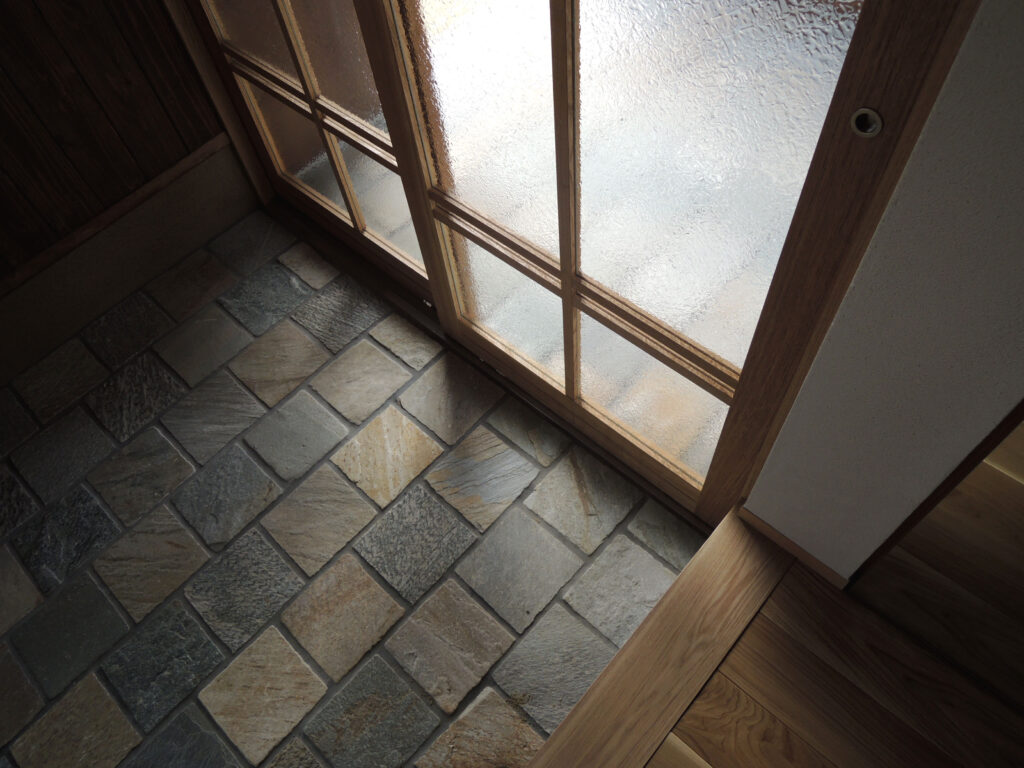 写真は30~50ミリの厚さの石を張った玄関。落ち着いた雰囲気で毎日、家族を見送り迎え入れてくれます。