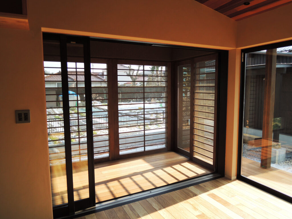 写真は内側がアルミサッシでデッキスペースの外側は木製建具(網戸あり)を入れています。どちらも片引きでフルオープンとなります。この家では別に小さな出入口を作り、ネコちゃんの居場所にもなっています。